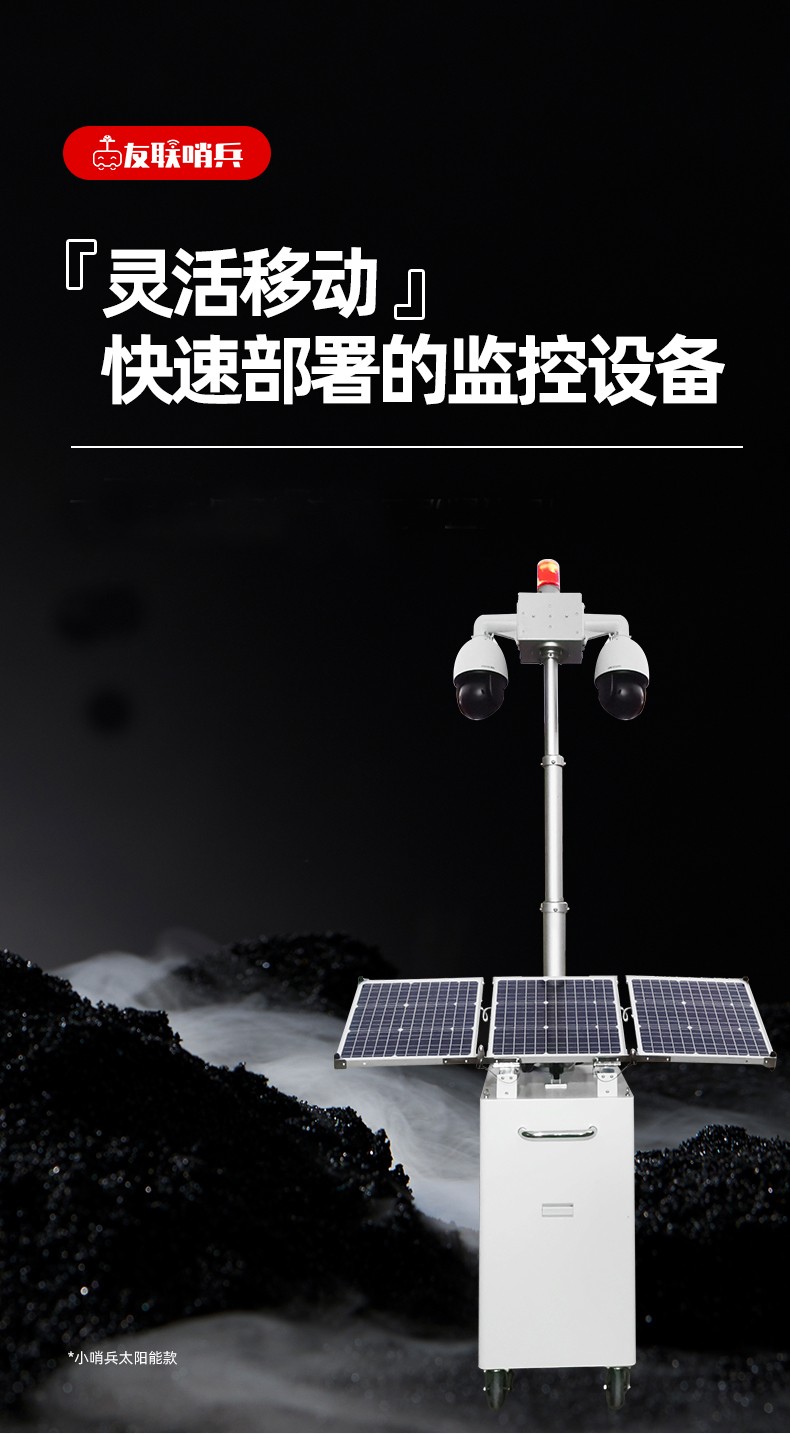 輕巧款小哨兵移動監控系統 友聯哨兵新一代輕巧款迷你小哨兵移動監控系統,機型小巧可移動,靈活看護,免布線,隨用隨放的優點。主要用于視頻監控、取證,采用“電池+電源”等多模式供電,無線網絡傳輸,一鍵開機超便捷 ;整機投入使用,無需拆裝,縮短工期;一次性費用投入,多場景反復使用,獲得更大投入產出比;根據項目進度更改部署位置,使用更靈活;可加選AI功能,滿足客戶智能化識別需求,如支持人臉識別,車牌識別、安全帽檢測、反光衣檢測、抽煙檢測、溫濕度監控、揚塵監控等功能。
