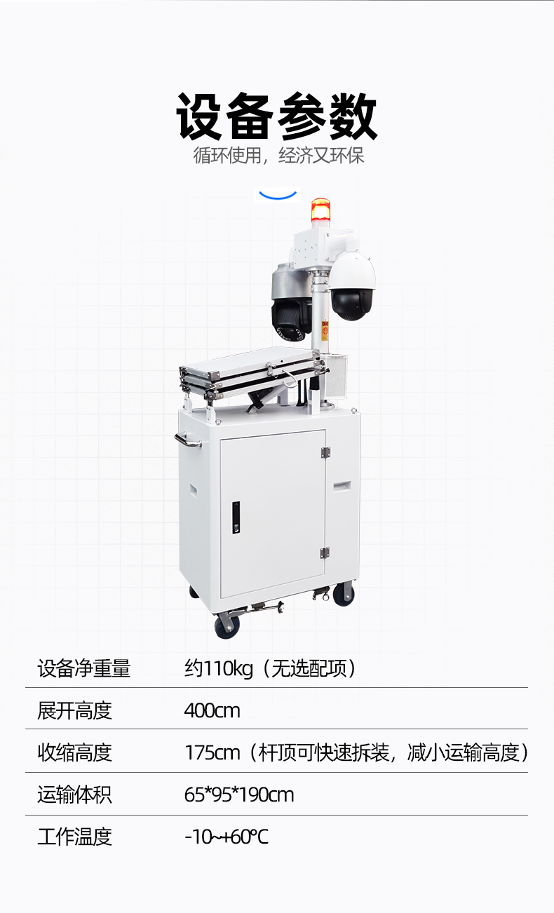 友聯哨兵多功能移動兵站-輕便型移動監控 友聯哨兵多功能移動兵站(輕便型小哨兵移動監控)是一款十分靈活的中小型移動監控設備,自帶網電,具備較高的機動性,系統可集高清視頻監控、照明、報警、廣播、對講、氣象環境監測、存儲、控制、無線傳輸、一鍵升降等功能于一體,并可具備市電、太陽能等多種能源補給方式,提升續航時間,以適應各類復雜的環境。戶外使用,不懼風雨,隨需移動,循環利用??蓮V泛用于石油管道巡檢、工地監控、電力維修監控、活動安防、戶外作業等臨時監控或長期監控。
